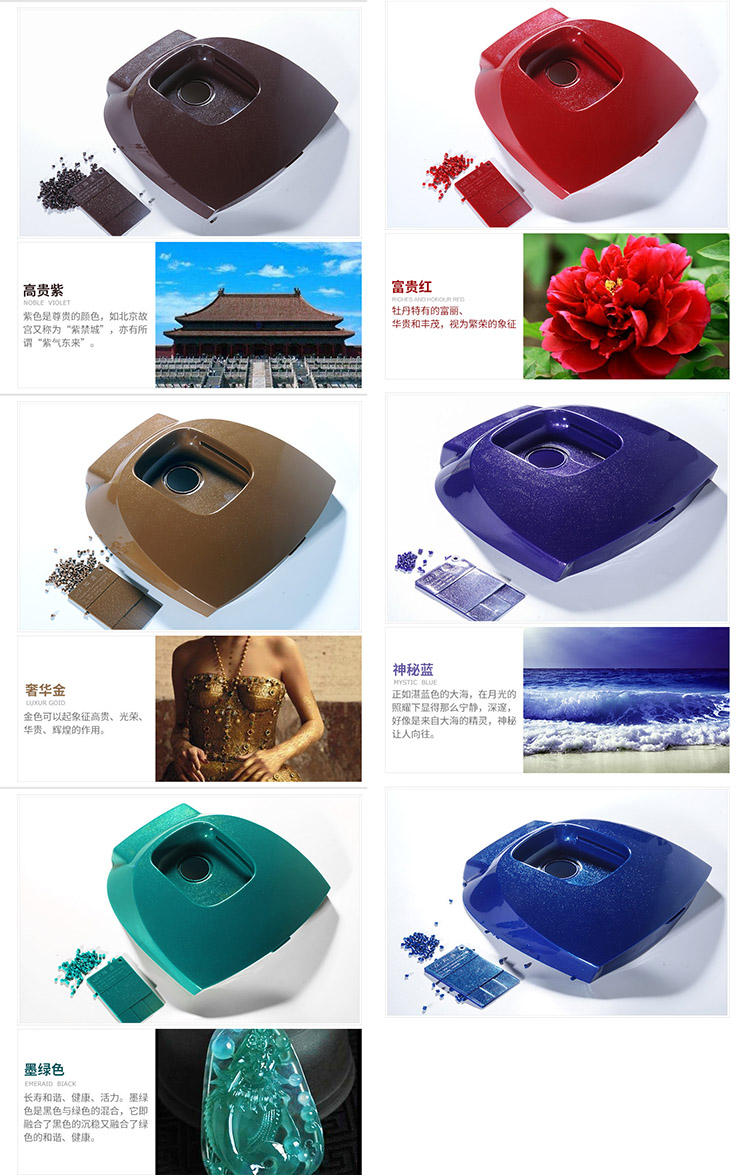 免噴涂美學塑料色彩豐富,包括金屬、自然、水晶、紋路等多樣外觀效果。金屬,細膩絲滑;自然,純美;水晶,清澈明亮;紋路,流云炫彩。時尚且富有科技性的質感易激發設計師的靈感,創造出更精美的產品。